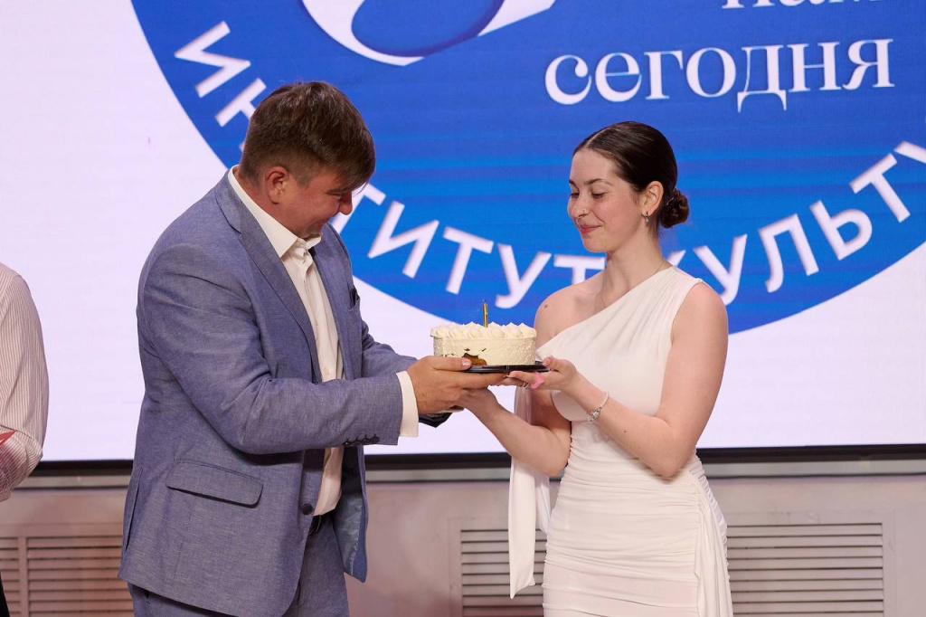 Мероприятие стартовало с того, что выпускники поздравили МГИК в лице и.о. ректора Дмитрия Сергеевича Сидорова с 95-летием и вынесли торт со свечой.